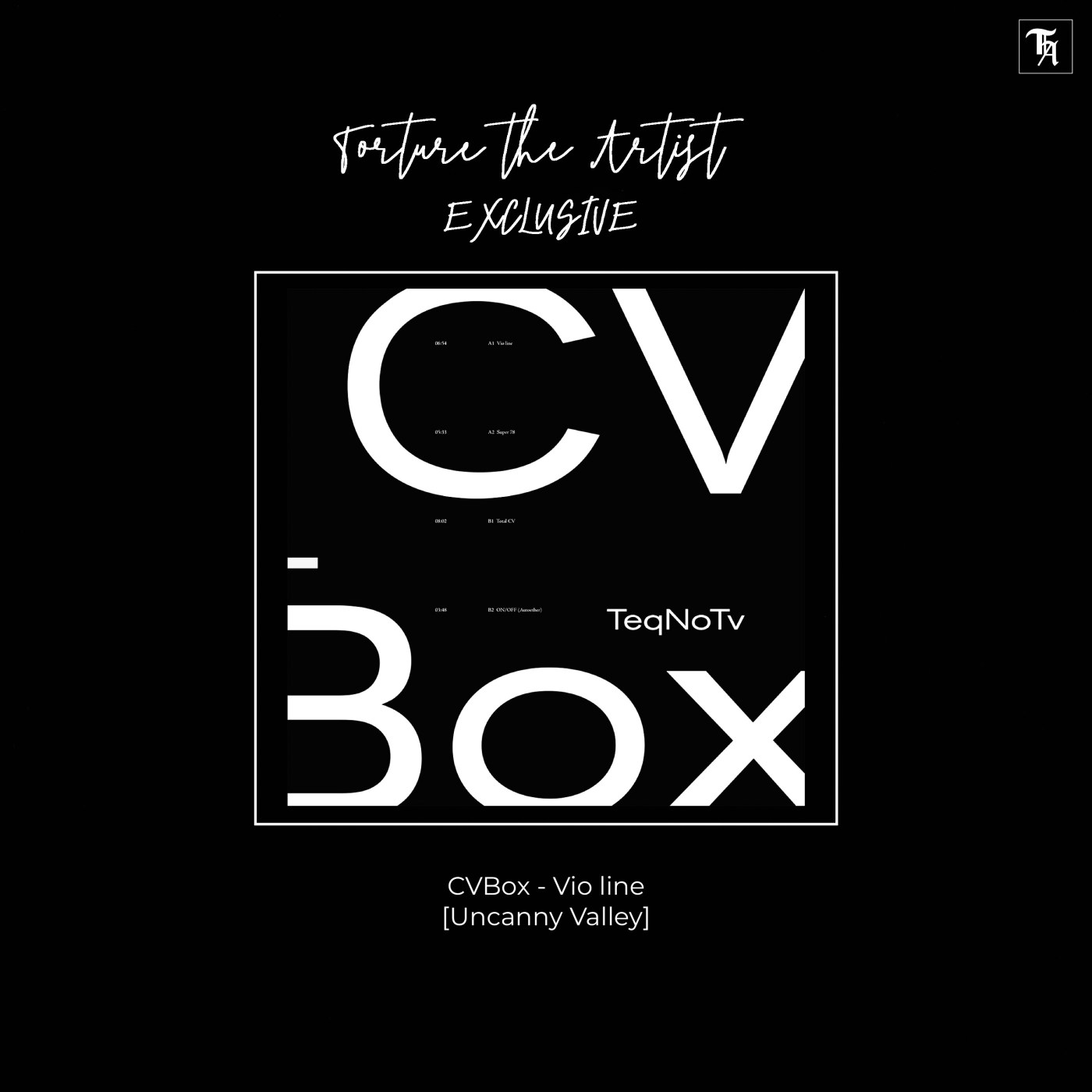 It’s February. It’s cold. It’s time for Uncanny Valley’s first release of 2021 to warm up any Techno head’s heart with legendary yet mysterious artist CVBox. Three years have passed since the artist’s LP So Ist Es Im Nadelwald, which was also out on Uncanny Valley. Now it’s time for some TeqNoTv or four new takes mostly dedicated to the straight four to the floor genre, of course with various nuances like Super 78‘s dubby feel, Total CV‘s dreamy synthline-sequences, On/Off (Autoether)‘s ambivalence of warm chords in a pure Techno-surrounding and the EP’s opener Vio line‘s Acid-line and robotic vocals turning the track to a somehwat futuristic-sounding take that is so precisely arranged and sequenced that it’s sharpnness hefts one right into a dark sweaty club evoking picture of an a crowd dancing on the a razor’s edge.