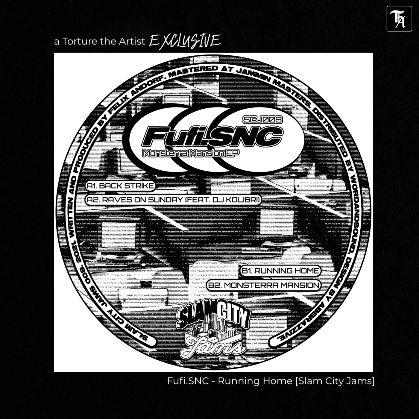 It’s been a moment since Munich-based and Rhode & Brown run label Slam City Jams celebrated a release, but after a little hiatus SLC takes the shortcut to neighboring Ingolstadt in order to sign four tracks from Fufi.SNC. The four-tracker, Monsterra Mansion, is a musically homage to 90’s Breaks, Rave and (Acid)House-sound with some intercosmic impacts to twirl one around the yet to be opened dancefloors. The b1, Running Home, kicks off fulminantely with its break-beat-bassline enriched with deeply touched chords and a bleepy Acid-line that sound-wise not only adjusts its volume to the other elements but in the course of the track determines the track’s momentum before it results in a short but sweet piano intermezzo. Running Home, as the track title suggests, is coming or hitting close to home, musically and geographically and is one of these tunes you certainly cannot and foremost do not want to avoid when putting your dancing shoes back on.